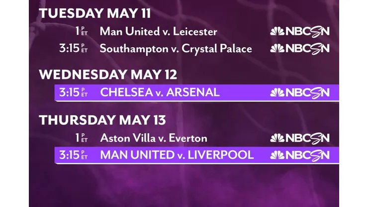 Beginning this afternoon, NBC Sports presents five midweek matches as the Premier League comes to a frenzied 13-day finish with teams in third through eighth place separated by only nine points.
