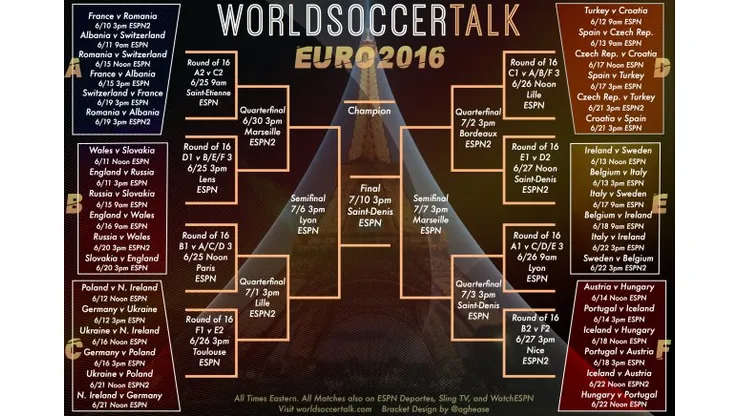 Unlike other Euro 2016 brackets, we’ve created one that is printer-friendly (formatted in PDF). It’s easy to read, and includes the TV listings for all of the games.