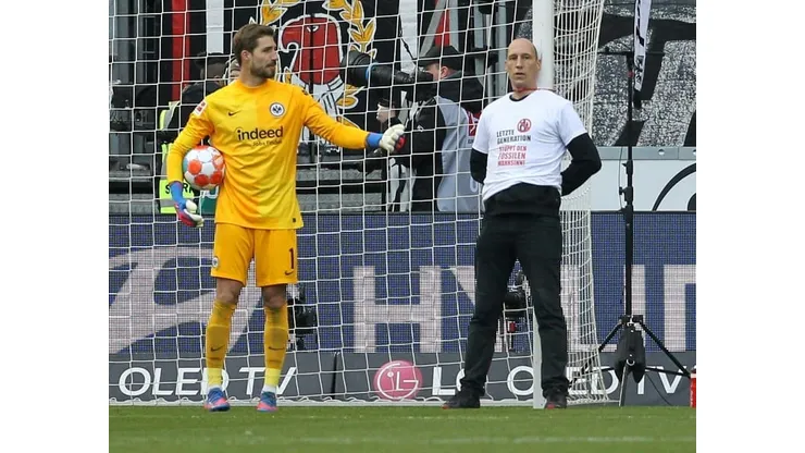 Shortly after kick-off, protestors wearing t-shirts bearing the German text “Last Generation – Stop the Fossil Fuel Madness” each tied themselves to a post in the Frankfurt goal.