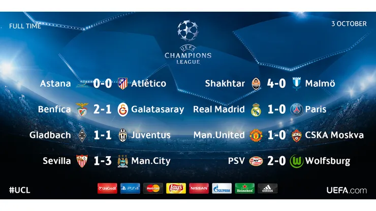 Today: Gladbach 1-1 Juventus; Sevilla 1-3 Manchester City.
