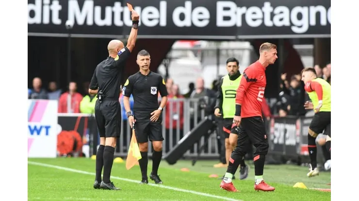 In Rennes, the home team’s substitute goalkeeper Romain Salin received two yellow cards in quick succession for arguing from the touchline.