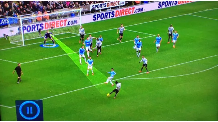 The picture below shows that the only players in the England number 1’s vision were Manchester City players. Gouffran is nowhere near Hart’s eye line. Mike Jones is in a decent position, but the force of the strike was so much that he was possibly taken aback at how quickly the City players disputed the goal.