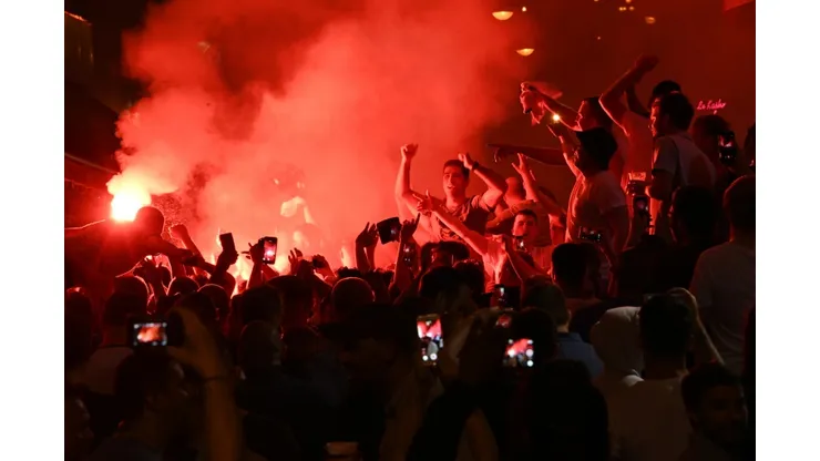 The night ended with hundreds of boozed-up and bare-chested fans standing, beer glasses in hand, staring down French CRS riot police on the other side of the street.