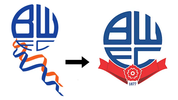 The new Bolton Wanderers club crest is a vast improvement over the ribbon one (above left). Not only is the new club crest bolder, but the addition of the Lancashire red rose emblem and year that the club was founded is a classy touch.