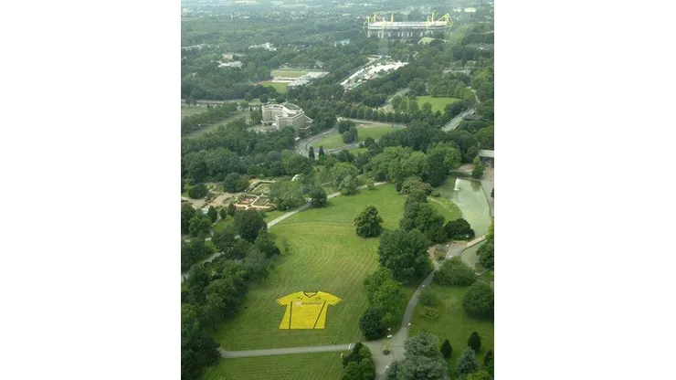 Dortmund’s new home shirt from Puma can be viewed from the above aerial shot with Dortmund’s Westfalen stadium viewable in the distance. The kit was launched with 80,645 (the average home attendance at BVB last season) yellow flowers creating an image of the kit.