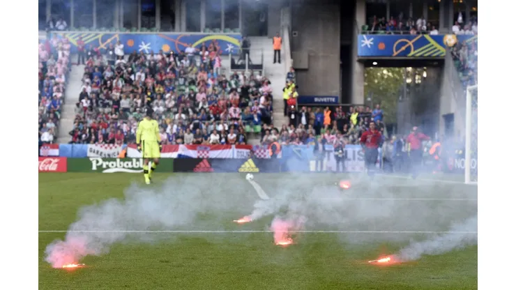 With Croatia 2-1 up, referee Mark Clattenberg briefly halted play when flares thrown from the Croatian fan block landed on the Saint-Etienne pitch, minutes before the 90 minutes were up.