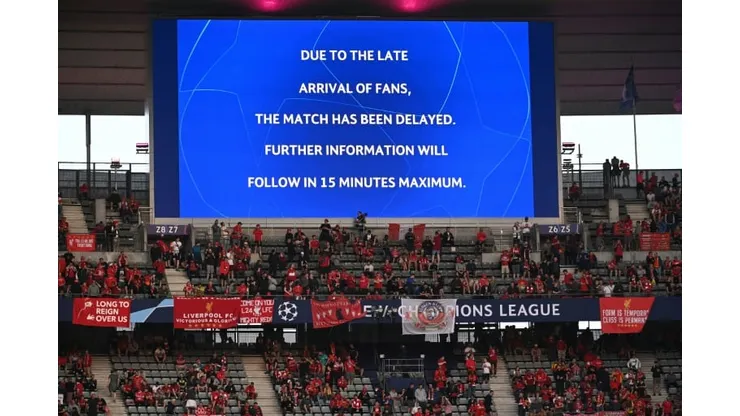 There were still large sections of empty seats in the official Liverpool end of the 80,000-capacity stadium at the time the game was supposed to start.