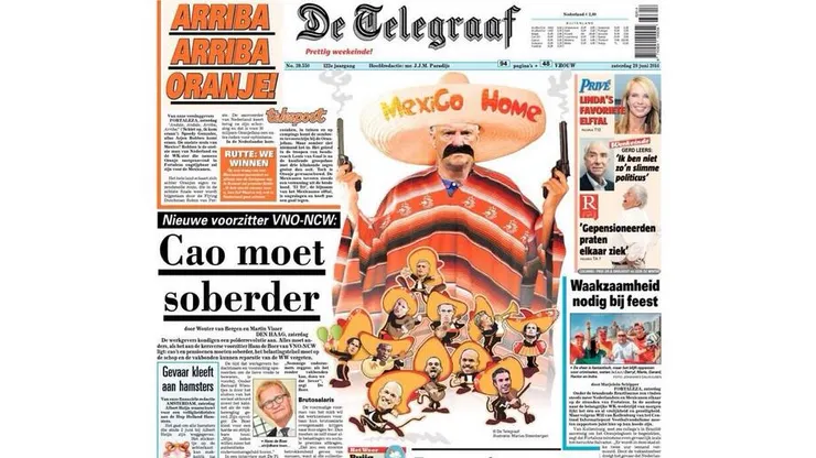 Dutch newspaper De Telegraaf ran a cartoon on the front cover of its newspaper today with Netherlands manager Louis Van Gaal wearing a sombrero that says “MexiGo Home,” as well as wearing a poncho and toting two guns.