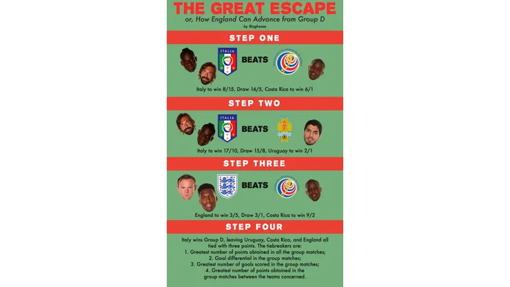 England still have a chance of advancing out of Group D but there’s a lot that has to happen in order for that to happen. Italy needs to beat Costa Rica and then Uruguay, then after beating Costa Rica themselves England have to hope they have the most goals out of the bottom three. Aram Gyan (@aghease) prepared a graphic demonstrating exactly what needs to happen in order for England to gain entrance to the round of 16. After losing their first two games, England’s hopes of advancing are bleak but if we’ve learned anything from this World Cup it’s that anything can happen.