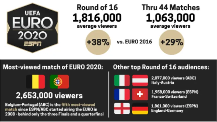 Through 44 EURO 2020 matches (Group Stage and Round of 16), the average audience across ABC, ESPN and ESPN2 is 1,063,000 viewers, a 29 percent increase over 822,400 viewers for comparable matches in 2016.