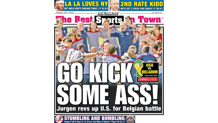 The New York Post wins everything (see above photo) with its bloodthirsty eagle embodying its Spirit of ’76 message – “Go Kick Some Ass.” Quite a turnaround from the paper that declared soccer “stupid” four years ago.