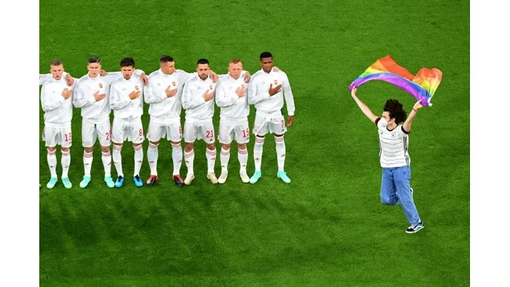 Just minutes before kick-off at Munich’s Allianz Arena, a fan wearing a Germany shirt and waving a large rainbow flag evaded security to invade the pitch, running in front of the lined-up teams before being tackled by stewards and led away.
