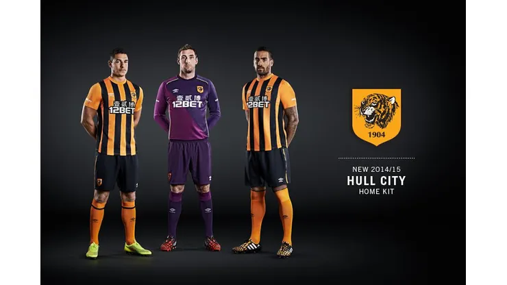 With shirts designed by Umbro, Hull City AFC will wear the home kit in the UEFA Europa League as well as the Premier League, featuring Hull’s unique color combination of amber and black stripes, as well as black shorts and amber socks.