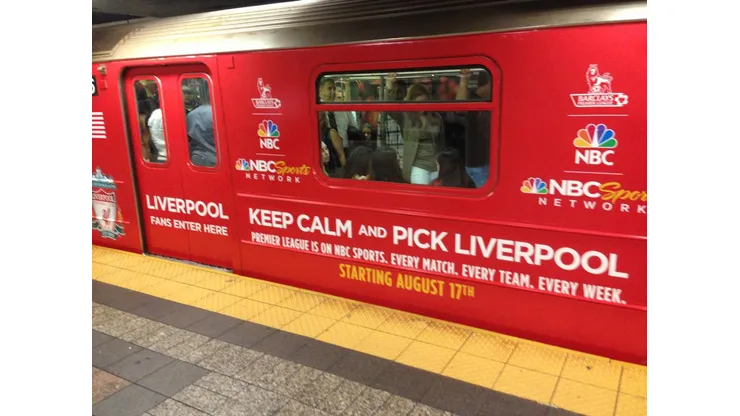The subway car has the words “Keep Calm and Pick Liverpool” plastered along the side of the subway car. Presumably the other half of the subway car is in blue and says “Keep Calm and Pick Everton.” One of the features we didn’t notice until today is that the subway car doors say “Liverpool Fans Enter Here,” which is a great touch that’s probably confusing some commuters who aren’t soccer fans.