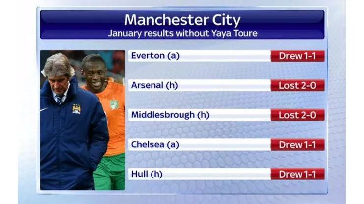 This season when Toure left for the AFCON, helping lead Cote d’Ivoire to the title, City was joint top with Chelsea. Since the midfielder left, the Blues are winless in five matches, having been eliminated from the FA Cup by Championship side Middlesbrough and sit seven points behind Chelsea.