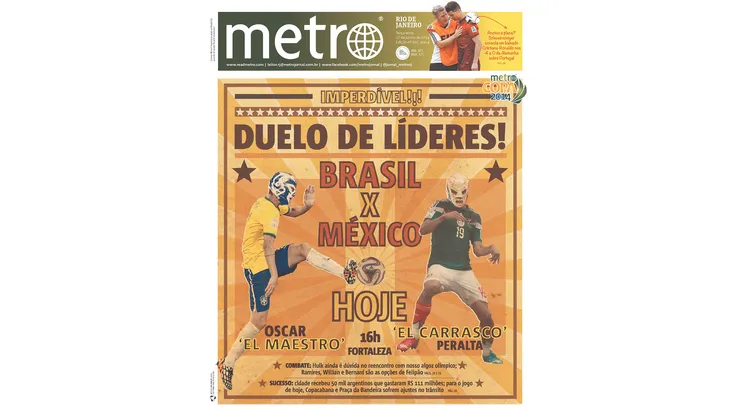 In Brazil (see above front cover photo), Metroof Rio De Janeiro (and other cities) wins the front page for the day with an amusing mock-Lucha Libre poster pitting Oscar “El Maestro” against Obie “El Carrasco” Peralta. Peralta, Hector Herrera, Dos Santos of Mexico and Neymar, Oscar, Thiago Silva, and Hulk are some of the stars of that 2012 Olympics to feature in this World Cup.