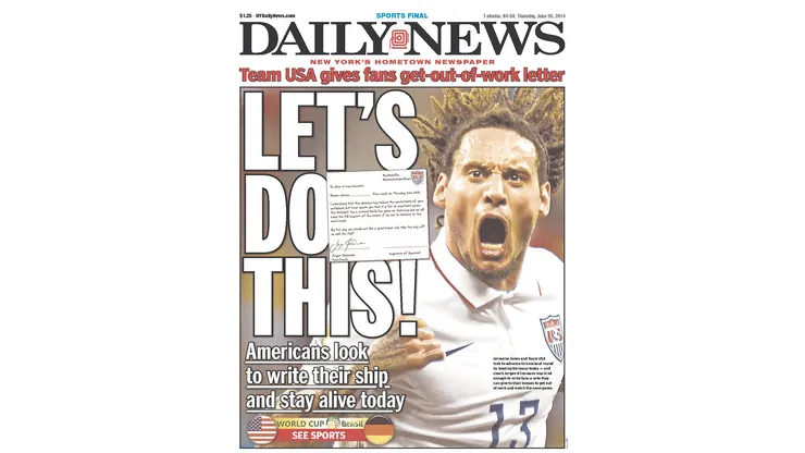 The New York Daily News (above) wins the front page of the day with its inspiring headline backed by a fiery Jermaine Jones. Look into his eyes and see George Washington’s tactical genius, Huck Finn’s adventurous spirit, Horatio Alger’s can-do attitude, Teddy Roosevelt’s drive, Babe Ruth’s power, Chuck Yeager’s courage, Mohammed Ali’s confidence, Mike Tyson’s fury, and Michael Jordan’s swagger.