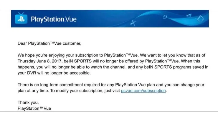 No explanation was given by PlayStation Vue why they removed the beIN SPORTS, beIN SPORTS en Español and beIN SPORTS Connect channels.