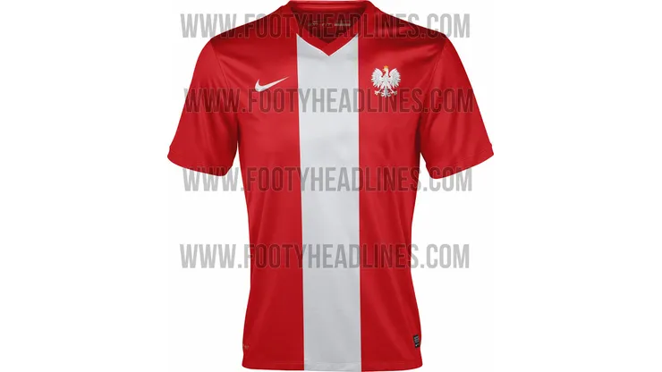 In a photograph leaked on the Internet, Poland’s new away shirt for 2014 is a perfectly designed red and white shirt featuring a white stripe down the middle of the jersey. The away shirt has a perfect symmetry. The red v-neck collar, white and gold Polish football federation crest and Nike swoosh complement the shirt.