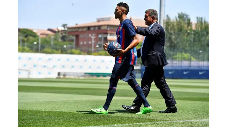 Laporta gave Raphinha a Barca shirt with his name on it, but without a number, before both signed the contract in front of the cameras.