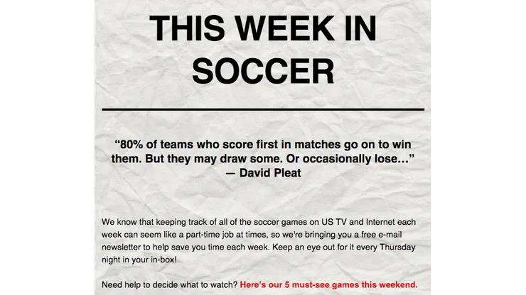 Beginning today, you can now receive a comprehensive guide to the weekly soccer TV and Internet listings with a free newsletter delivered to your email in-box every Thursday night.
