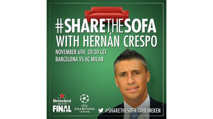 Join Heinken on the sofa today at 2:30pm ET as former Chelsea and Inter Milan great Hernan Crespo will be watching Barcelona against A.C. Milan, answering your questions on the match, his career and the beautiful game in general. Simply follow @Heineken on Twitter and tweet your question to Hernan during the game, including @Heineken and #ShareTheSofa in the tweet.