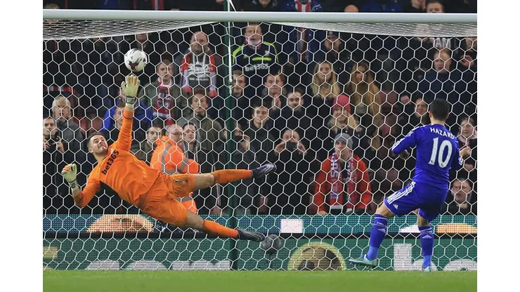 The England goalkeeper then proved the hero of the night – with Hazard the villain – as he made the decisive intervention in the shootout to send Stoke through to the quarter-finals.