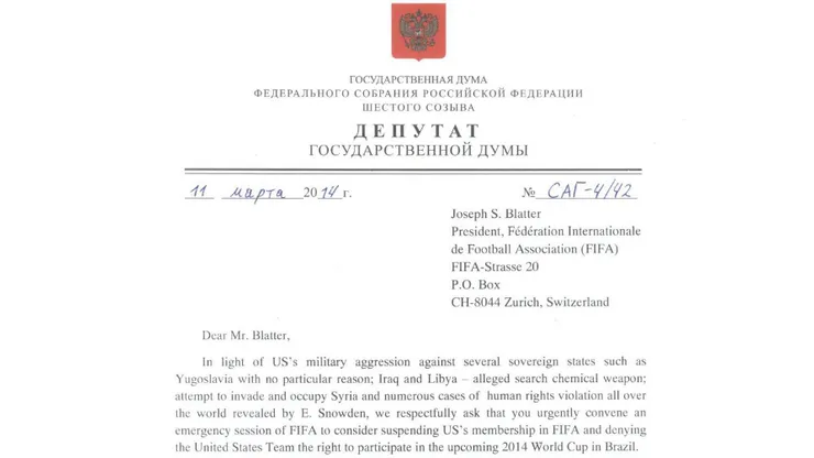 Alexander Sidyakin and Michael Markelov, two members of the Duma, addressed their concern to FIFA about the United States and asked that FIFA would “urgently convene an emergency session to consider suspending the United States FIFA membership and denying the USMNT the right to participate in the 2014 FIFA World Cup in Brazil.”