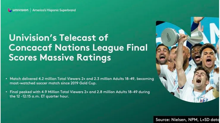 Univision’s TUDN’s telecast of the heart-pounding Concacaf Nations League Final became the most-watched soccer match since the 2019 Gold Cup and the number one program on all of television for the entire week (among adults 18-49 and adults 18-34).