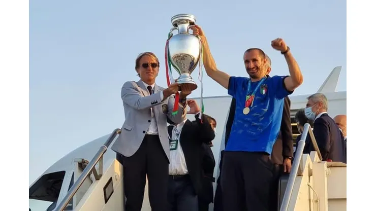 Giorgio Chiellini, the team’s 36-year-old captain, and coach Roberto Mancini lifted the gleaming trophy aloft after the team’s plane touched down in Rome just hours after the victory in London on Sunday night.