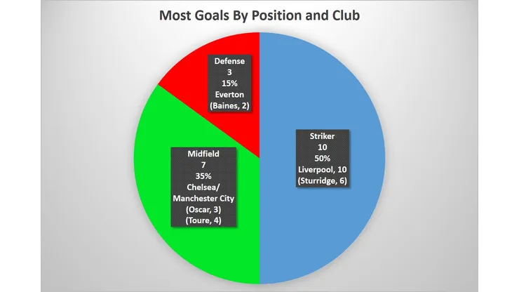We don’t have to waste this time though. The break is an excellent opportunity to analyze the statistical progress clubs have made in the early stages of this season. In light of this, let’s take a look at goals; more specifically, where they’re coming from. The graphs below show the total goals each club has scored, divided up among striker, midfield, and defense. They also show the percentage each position is contributing and the top scorers for each position.