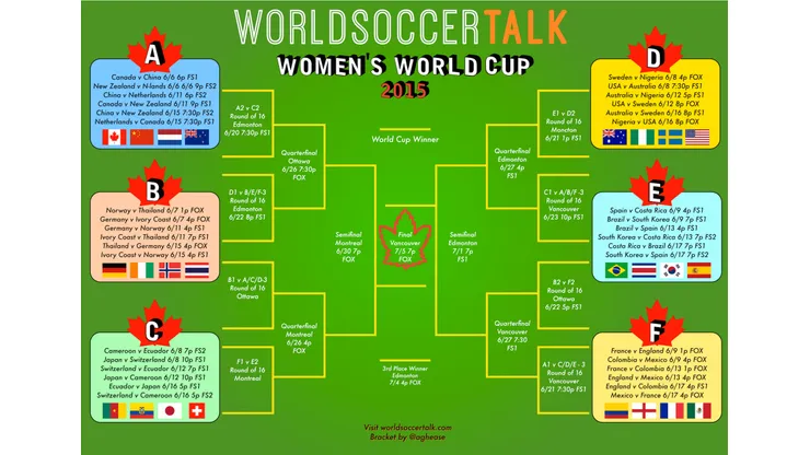 World Soccer Talk has created one bracket that lists all games as well as game times and the channels they will be shown on.