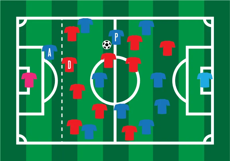 In the diagram above, the blue player with the ball (‘P’) passes it to their teammate labeled ‘A.’ When the pass is played, player ‘A’ is offside because he is closer to the opponents goal than the ball and the second-last opponent (player ‘D’). Every other blue player in the diagram would be considered onside. There are two exceptions that allow for offsides. 1. Throw-ins 2. All field players are on the attacking team’s defensive half. All other times an offside pass results in a free kick to the opposing team.
