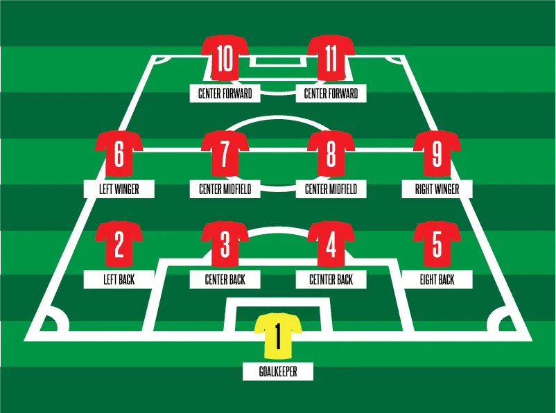 Formations are labeled with a series of numbers beginning with the amount of defenders on the pitch, then midfielders, then finally forwards. For example: a 4-4-2 formation consists of four defenders, four midfielders, and two forwards. Goalkeepers are not included in formations, as every team deploys just the one goalie. Below is an example of a basic 4-4-2 formation.