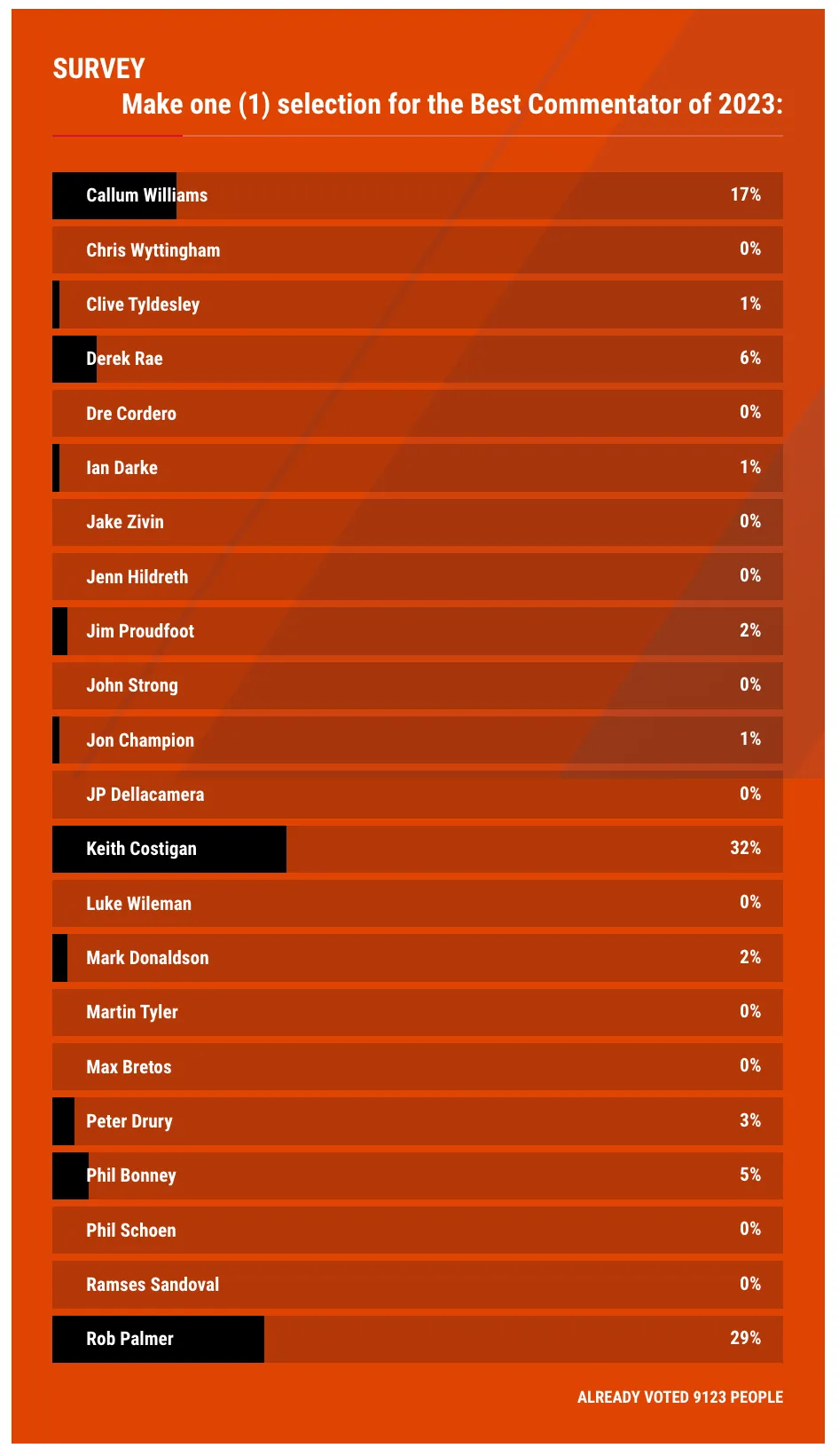 You can also frequent back to this page. Check which commentator is leading the poll, as it updates after each person votes. If you are unfamiliar with a certain commentator, use this as an opportunity to familiarize yourself. However, there are surely names here that you can associate with some of the sport’s most historical moments.