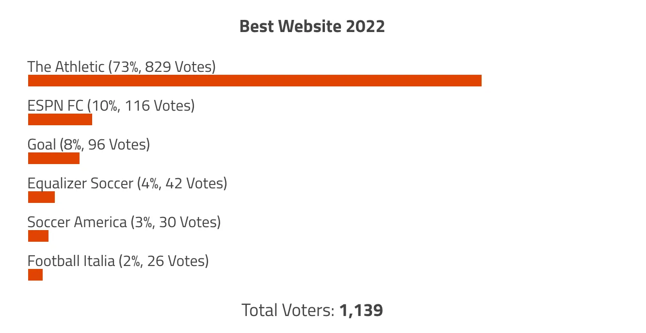 Therefore, as part of the 2022 World Soccer Talk Awards, you can vote on which platform you think is the best website for soccer fans. This is also a chance for you to grow accustomed to what other websites may provide. Some nominees, like the Athletic, feature in depth stories about specific players or teams. Others, like ESPN FC, cater to a more general audience that wants to keep up with all the sports.