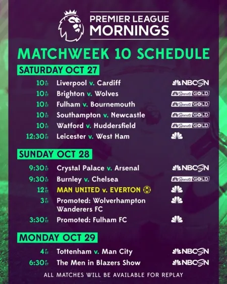 Weekend coverage begins on Saturday with Premier League Mornings at 9 a.m. ET on NBSCN. Then, Mohamed Salah and Liverpool will kick off the weekend’s action as they host Cardiff City at 10 a.m. ET on NBCSN and Universo. Coming off last week’s win against Fulham, Cardiff City aim to hand Liverpool their first league loss of the season. NBC Sports Gold will also present four matches Saturday at 10 a.m. ET with Brighton v. Wolverhampton Wanderers, Fulham v. Bournemouth, Southampton v. Newcastle, and Watford v. Huddersfield Town.