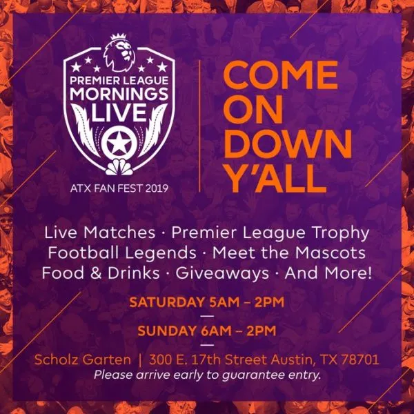 The Austin fan festival is the first Premier League Mornings Live supporter event that NBC Sports and the Premier League will present this football season, with two more coming later in the 2019-20 campaign. This follows three successful festivals (Boston, New York, and Washington, D.C.) during the 2018-19 Premier League season.