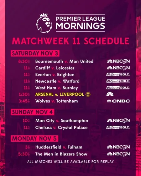 This week’s live match coverage wraps up on Monday, Nov. 5, at 2 p.m. ET with Premier League Live on NBCSN, followed by Huddersfield v. Fulham at 3 p.m. ET. Monday at 5 p.m. ET, NBCSN presents a live Goal Zone. Rebecca Lowe hosts Premier League Mornings, Premier League Live, and Goal Zone, joined by former Jamaica National Team player Robbie Earle, and former U.S. Men’s National Team midfielder Kyle Martino.