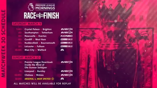 NBC Sports’ Premier League coverage this weekend begins Saturday, March 9 at 7 a.m. ET with Premier League Mornings, followed by a doubleheader on NBCSN. Match coverage begins with Crystal Palace v. Brighton & Hove Albion at 7:30 a.m. ET, followed by Southampton v. 3rd-place Tottenham on NBCSN and Universo. Harry Kane and Tottenham will be looking to snap a 3-match winless streak in the Premier League.