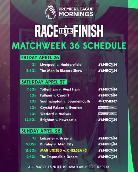NBC Sports’ Premier League coverage concludes on Sunday, April 28 at 11:30 a.m. ET with sixth-place Manchester United v. fourth-place Chelsea on NBCSN and Telemundo. Separated by only three points, the two teams face a critical battle in determining the top-4 picture.