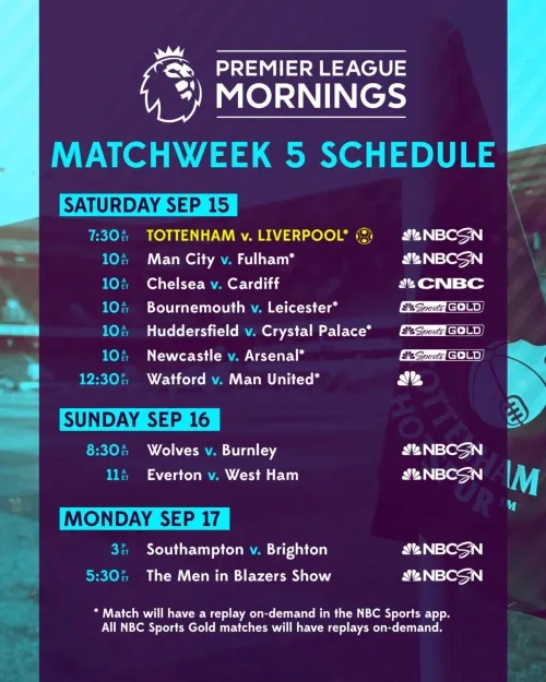 On Monday, Sept. 17, live match coverage begins with Premier League Live at 2 p.m. ET on NBCSN, followed by Southampton v. Brighton & Hove Albion at 3 p.m. ET, and a live Goal Zone at 5 p.m. ET.