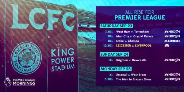 NBC Sports Group’s live Premier League coverage continues this week, highlighted by Liverpool visiting Jamie Vardy and Leicester City this Saturday, September 23, at 12:30 p.m. ET on NBC and Universo. Vardy has scored four goals for the Foxes so far this season, tied for third-most in the league, while Liverpool come off a 1-1 draw with Burnley.