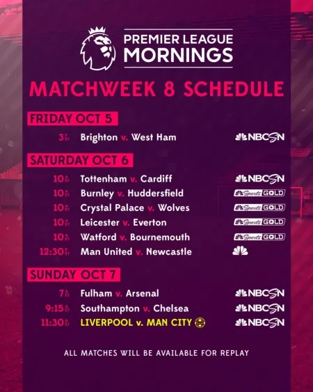 This week’s live Premier League action begins Friday, October 5, at 2 p.m. ET with Premier League Live, followed by Brighton & Hove Albion v. West Ham at 3 p.m. ET, and a live Goal Zone at 5 p.m. ET on NBCSN. Coverage continues Saturday, October 6, at 9 a.m. ET with Premier League Mornings on NBCSN, followed by Tottenham v. Cardiff City at 10 am. ET on NBCSN and Universo. Tottenham come off a 2-0 win over Huddersfield Town, with both goals scored by Harry Kane.