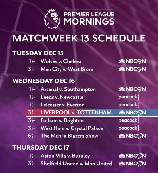 Wednesday’s coverage begins at Noon ET with Premier League Live on NBCSN, followed by three matches at 1 p.m. ET: Arsenal v. Southampton (NBCSN, Universo), Leeds United v. Newcastle (Peacock Premium), and third-place Leicester City v. Everton (Peacock Premium). Next at 3 p.m. ET on Peacock Premium, Fulham host Brighton & Hove Albion and Crystal Palace visit West Ham.