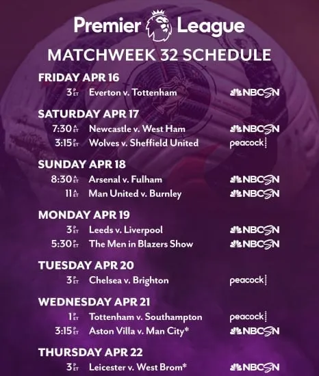 The week’s coverage concludes Thursday, April 22 at 3 p.m. ET as third-place Leicester City host West Brom (NBCSN, Peacock).