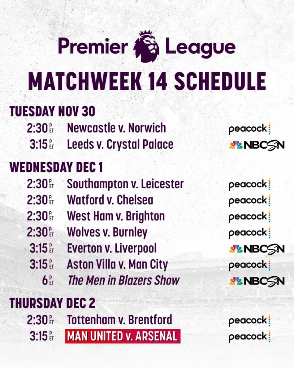3:15 p.m. — Manchester United vs. Arsenal. Peacock Premium. — Arlo White and Graeme Le Saux.