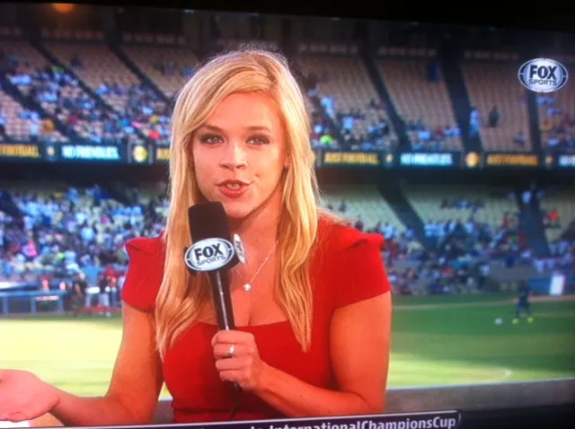 Stewart-Binks joined FOX Sports 1 this summer, and is one of several women with blonde hair that the Rupert Murdoch-owned company has hired to work for FOX Sports 1 (along with Charissa Thompson, Erin Andrews and Molly McGrath). Sky Sports, also owned by Murdoch, employs a similar policy of hiring attractive women to present their sports news programs. Hopefully she knows her soccer too.