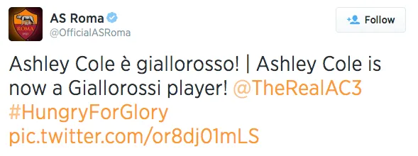 Cole’s move to Rome should help improve the Giallorossi who finished Serie A in second place. Cole’s experience in the Champions League will prove beneficial to head coach Rudi Garcia in his second season as manager.