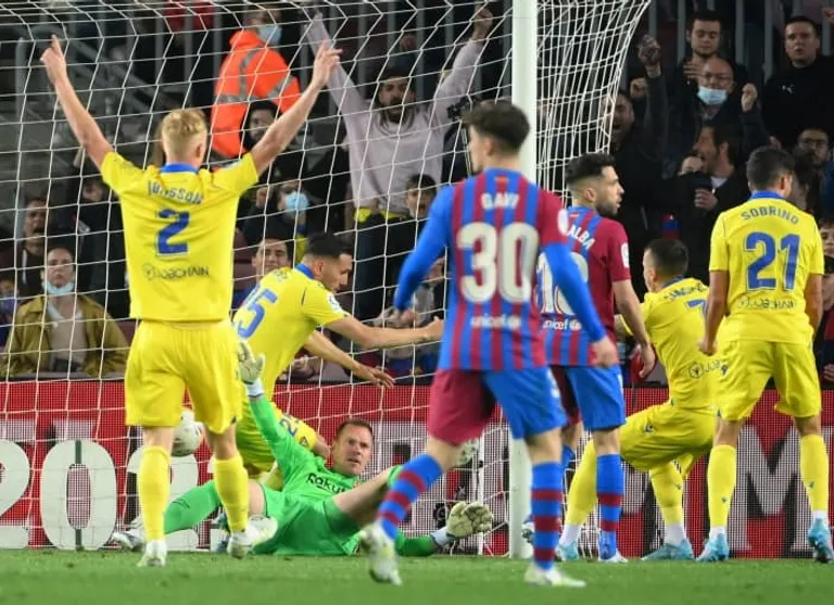 Cadiz continued to create the better chances and two minutes into the second half, they took the lead. Jordi Alba lost the ball in midfield and Alex’s cross found Sobrino, whose header was parried by Marc-Andre ter Stegen, only for Perez to follow in.